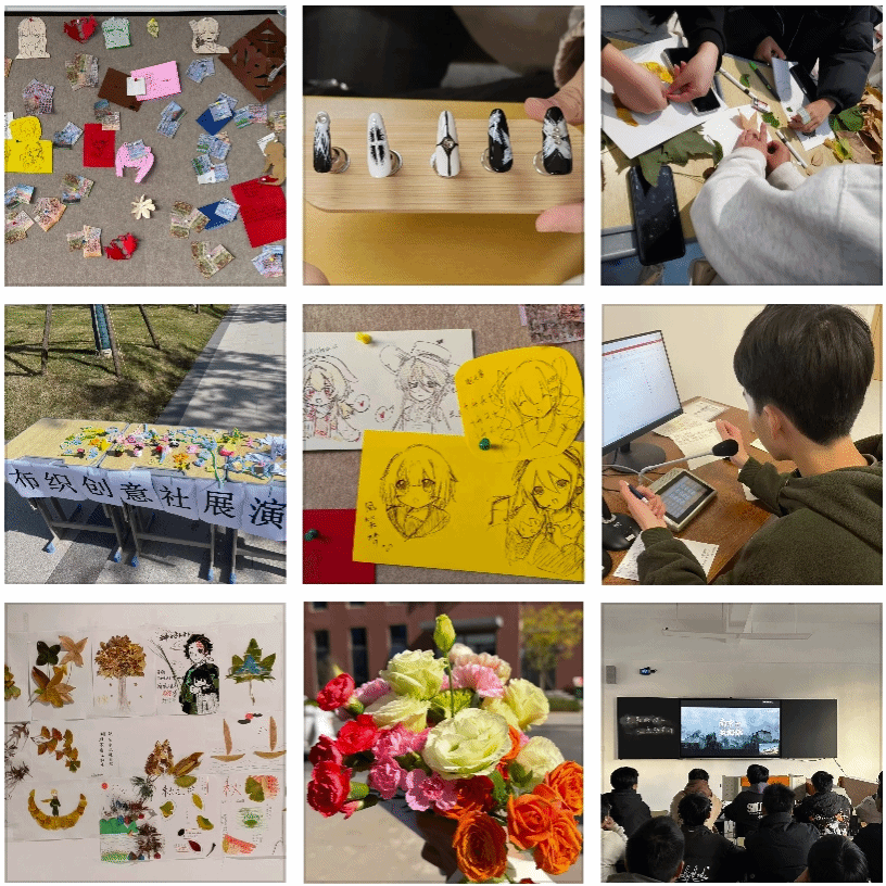 兴趣与工艺类社团:布织创意社展示折纸、装饰卡等手工作品,创意摆件错落陈列于展桌;美术社团的学子围坐桌前,以银杏叶、松枝等自然素材现场创作贴画,剪刀、胶带等工具排布间尽显巧思;首饰设计社的创作桌台上,美甲工具、装饰配件有序摆放,学子们专注设计作品;音乐舞蹈社的歌舞传递热血氛围;动漫社展出手绘作品与主题装饰板,吸引学子驻足互动;播音主持社团的成员操控专业设备,以话筒、提词器呈现流畅语言展示;新媒体中心记录现场瞬间,书影协会播放爱国主题影片,引发学子情感共鸣。